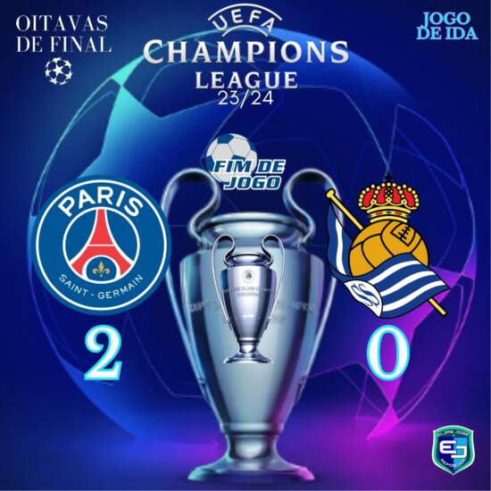 O PSG sofreu, mas venceu a Real Sociedad por 2 a 0 em casa, pelo primeiro jogo das oitavas de final da Champions League, e conquista uma boa vantagem para o duelo de volta. Os gols do jogo foram marcados no segundo tempo por Kylian Mbappé, aos 12 minutos, e Bradley Barcola, aos 25 minutos.