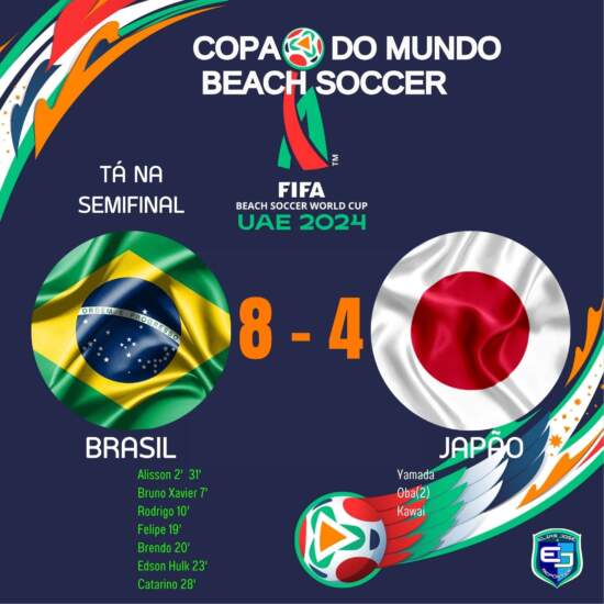 O Brasil venceu o Japão pelas quartas de final da Copa do Mundo FIFA de Beach Soccer – Dubai 2024, por 8 a 4. Foi mais um jogo emocionante, onde a seleção mostrou toda sua qualidade! Os gols da vitória foram de Alisson 2’ 31’, Bruno Xavier 7’, Rodrigo 10’, Felipe 19’ Brendo, 20’ Edson Hulk e Catarino 28′., Yamada, Oba(2) e Kawai fizeram os gols dos japoneses.