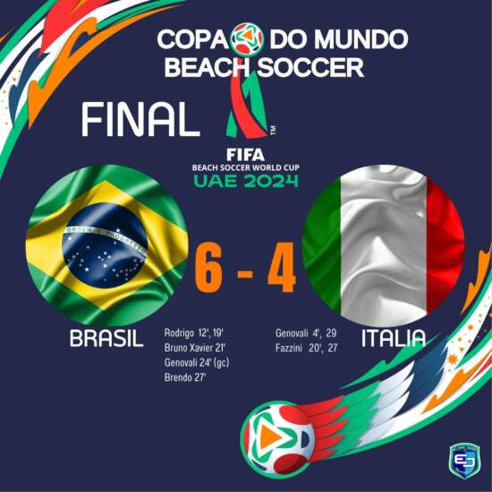 O Brasil enfrentou e venceu de virada a Itália 6 A 4 depois de sair atrás do Placar em Abudabi na Arábia Saudita. Com três gols Rodrigo, Bruno Xavier, Genovali(gc) e Brendo conquista o sexto título da copa do mundo de Beach Soccer, de forma invicta.